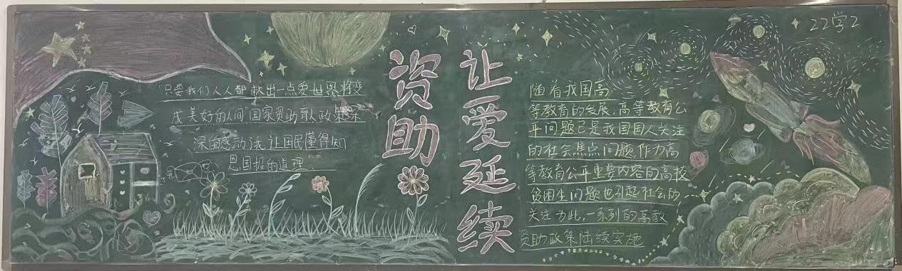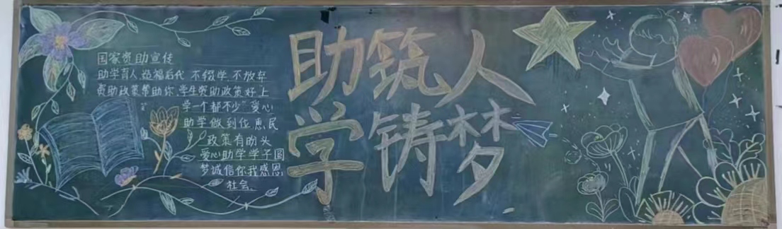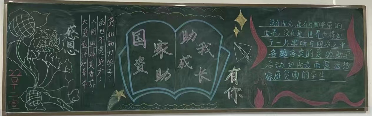 通过开展主题黑板报活动,加强了对同学们的诚信教育、感恩教育、励志教育,提高了同学们对国家的认同感和自豪感,激励着同学们发愤学习、回报社会。相信受到资助的同学们必将乘着国家资助政策的春风,筑梦圆梦,绽放青春之花!
