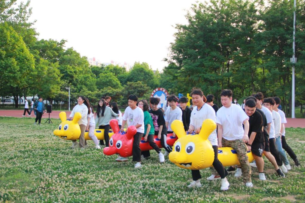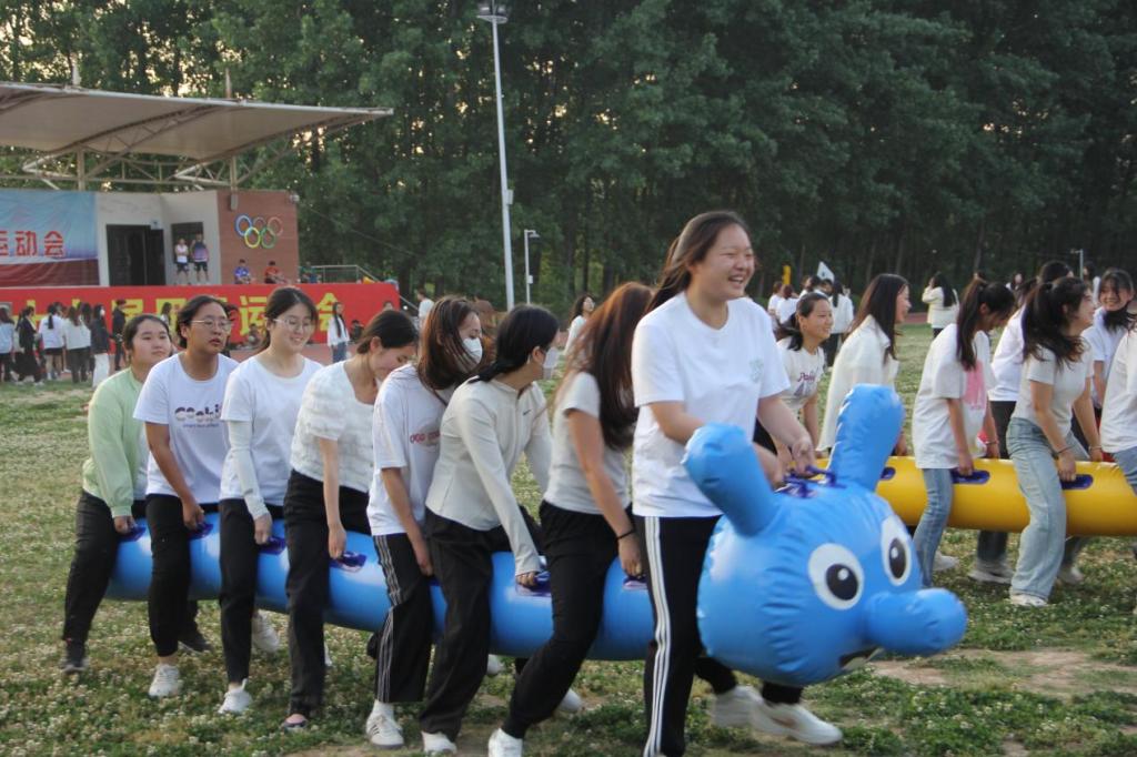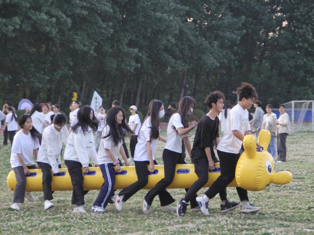 同学们骑在充气毛毛虫上,双手紧握固定把手,齐心协力向前冲。这项比赛不仅考验个人的平衡能力,更考验团队的协作与默契。同学们在比赛中互相鼓励、互相帮助,共同完成这项挑战,收获了合作的喜悦与成就感。