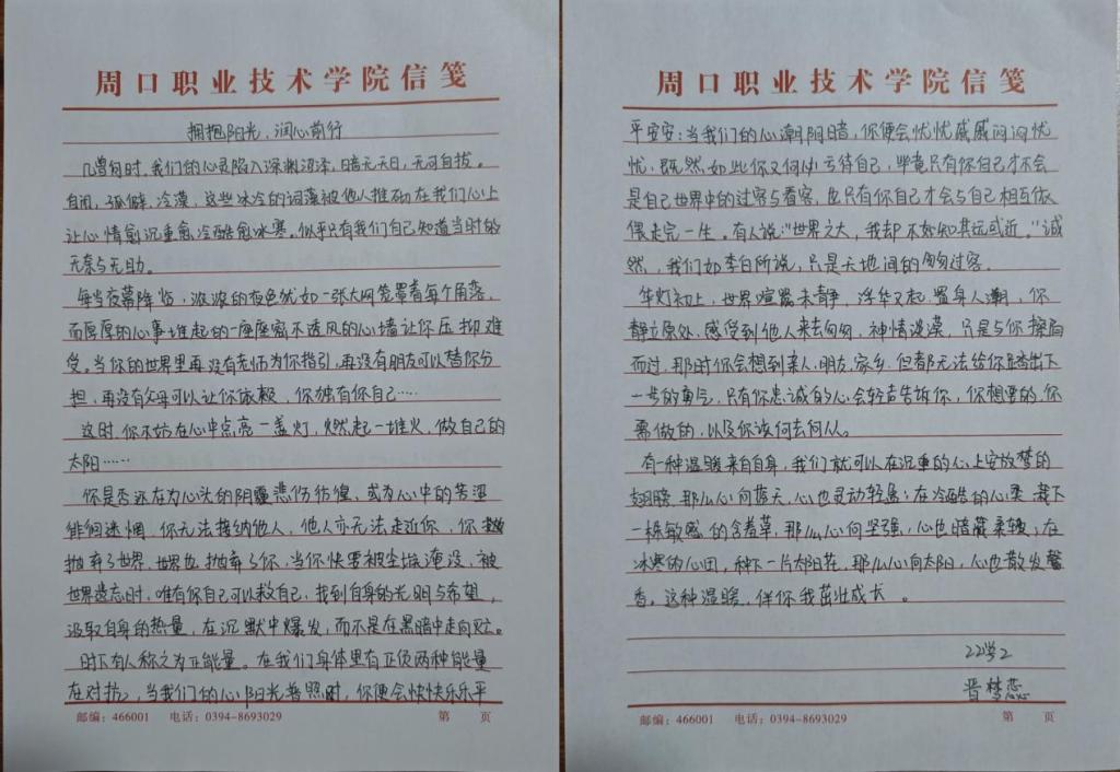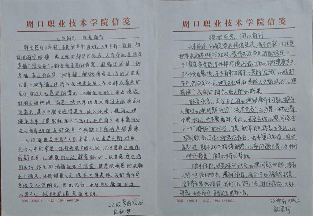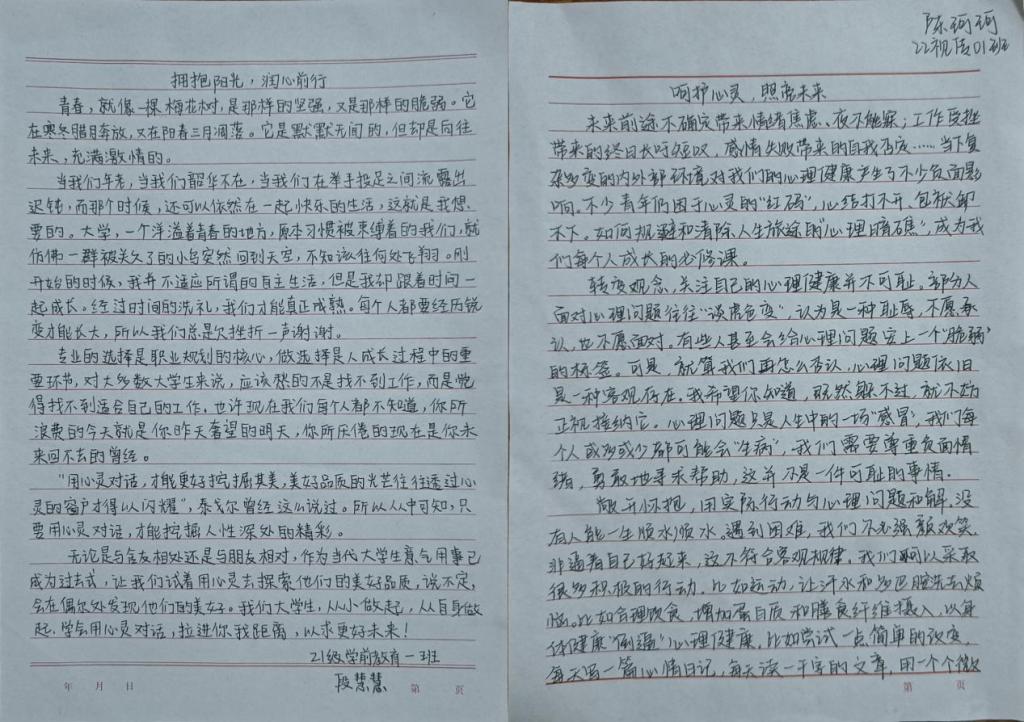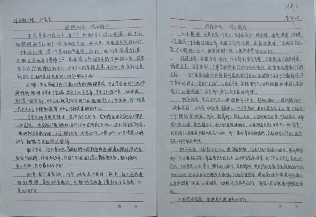 同学们积极参与此次活动,紧扣心理健康主题,结合自身经历和感悟,用心撰写文章。他们在文中详细分享了面对心理挑战时的有效应对方法,更深刻阐释了对心理健康重要性的理解。由此诞生出一篇篇优秀作品。接下来,让我们共同欣赏这些佳作吧!