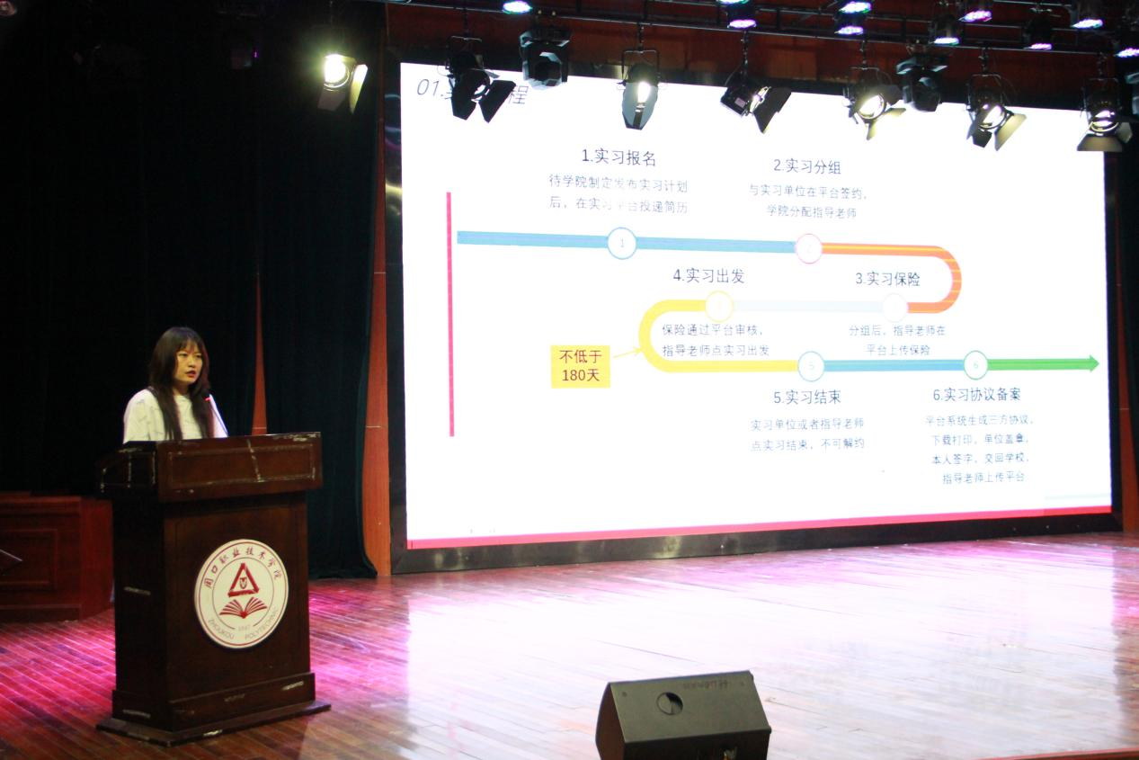 会议伊始,耿润传达了市级文件,结合文件向学生阐述了实习的重要性以及关于综合实习的学生管理规定,引导学生正确看待实习安排。她要求同学们调整好心态,正确对待岗位实习,要按时高质量地完成各阶段的实习任务。