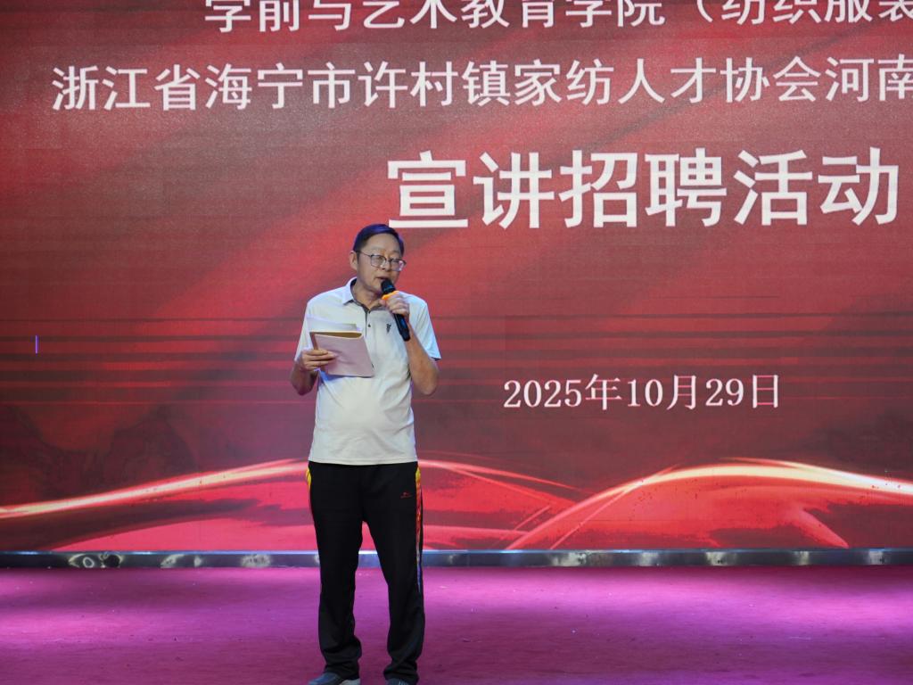 为精准对接高校人才培养与企业用人需求,助力学生高质量就业,10月29日下午,我院在艺术演播厅开展纺织服装专业企业宣讲会,浙江省海宁市许村镇家纺人才协会秘书长朱小平亲临现场进行宣讲。学院党总支书记王春生、副院长杨晨以及24、25级纺织服装专业学生共同参加活动。活动由院长高岐奎主持。