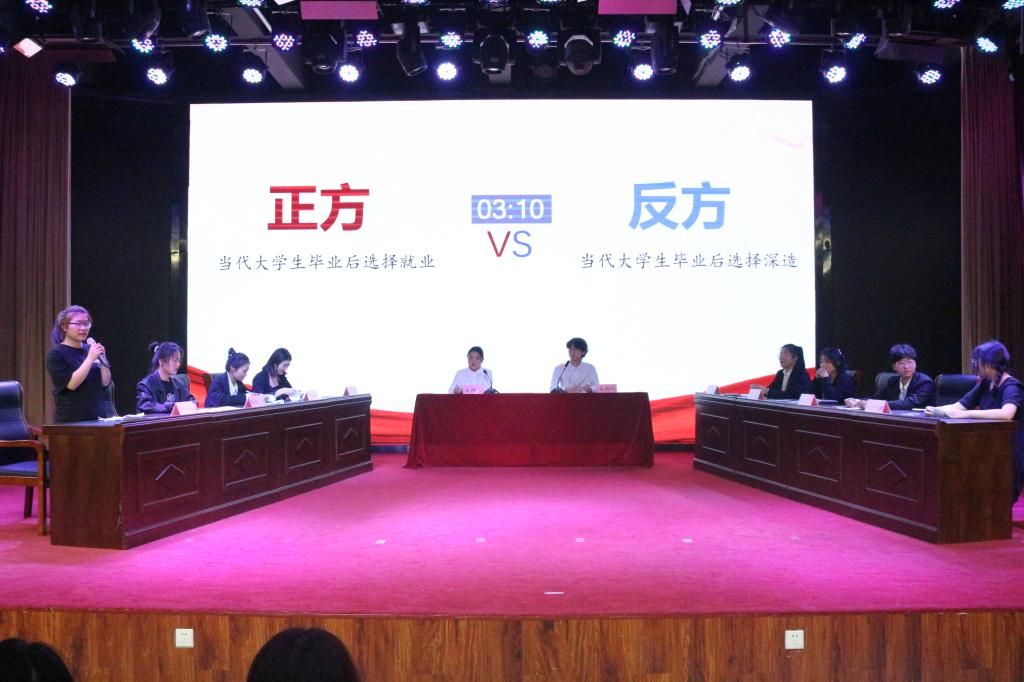 历经海选与初赛的层层角逐,最后由两支参赛队伍杀入总决赛。辩论双方就“当代大学生毕业后选择深造还是就业”这个问题展开辩论。赛场上,双方辩手睿智明理,旁征博引,唇枪舌剑,以儒雅的风采,机敏的反应,赢得了现场观众的阵阵掌声。赛后,评委老师分别对辩手的表现进行了精彩点评,并就辩论技巧给予了专业指导。经过现场投票,最终由正方代表队获得了本次辩论赛的冠军。最后,由各位领导老师对获得一等奖、二等奖、三等奖的队伍,以及最佳辩手进行颁奖。