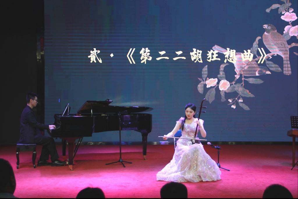 陈思玎同学现就读于中央音乐学院民乐系本科四年级二胡专业,她以一曲二胡独奏——《闲居吟》拉开音乐会的帷幕。乐曲典雅清越,展现了刘天华先生在逆境中依然保持乐观和怡然自得的心情,充满了宁静与恬淡。接着,她又演绎了几首风格各异的乐曲。其中《第二二胡狂想曲》采用了湖南民歌曲调和花鼓戏音调元素,地域色彩鲜明,充满了湖南音乐的独特韵味和“狂想曲”体裁的炫技持征;《秦腔主题随想曲》以陕西地方戏曲秦腔的音乐为素材,生动地表现了西北人民爽朗豪放的性格;《丝路拾光》以其充满异域风情的风格,带领大家畅游在丝路的广阔天地中;《河南小曲》以河南曲剧音调为素材,生动地表现了河南人民对家乡的赞美和主人翁的自豪感,令人印象深刻。