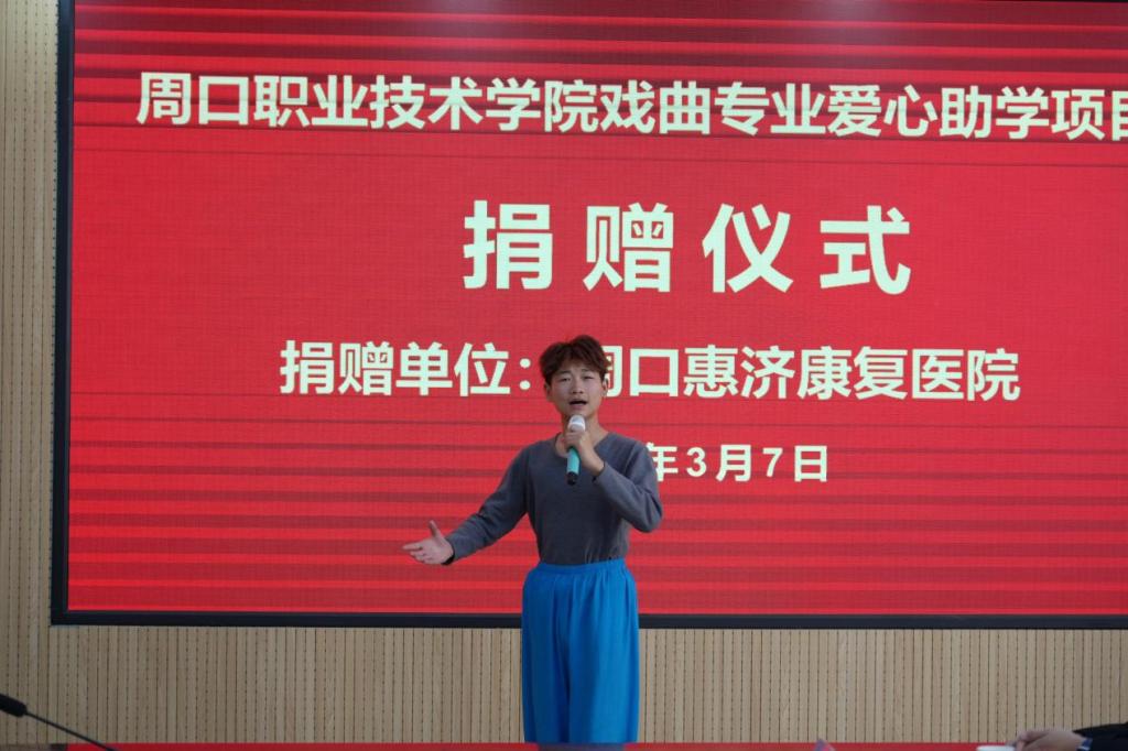 戏曲表演专业学生代表卢硕星发言,此次捐赠不仅为同学们提供了物质上的援助,更给予了精神上的鼓舞。同学们将化关爱为动力,全身心投入到戏曲学习中,积极传承并弘扬戏曲文化,让戏曲艺术在新时代绽放更耀眼的光芒。