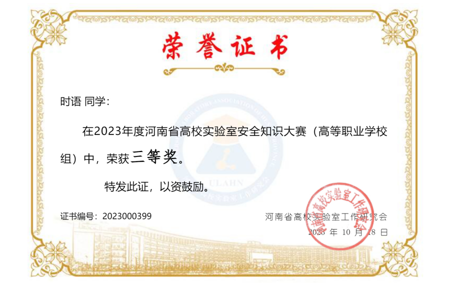根据《河南省高校实验室安全知识大赛活动方案》,WilliamHill官网于2023年10月18日组织开展了实验室安全知识大赛,我院23级学前教育一班时雨同学代表学校参加省级比赛,拿到三等奖的好成绩,希望受表彰的同学珍惜荣誉,再接再厉,为实验室安全做出新的贡献。