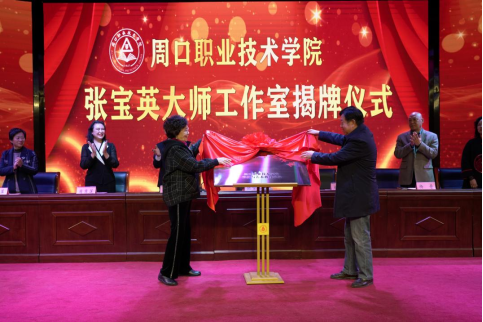校党委书记刘世欣(右)与张宝英大师(左)共同为”大师工作室”揭牌。